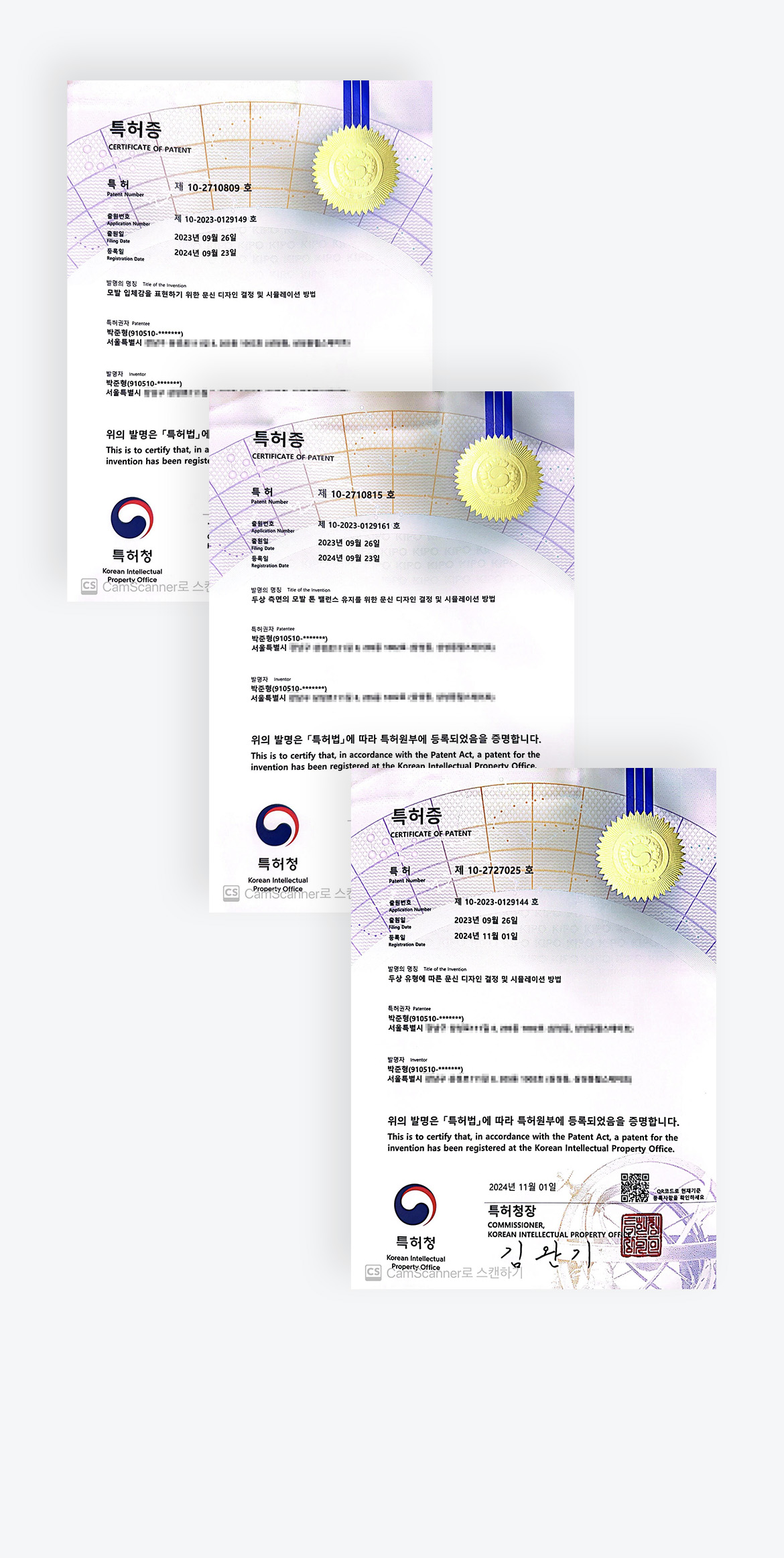 동양인 두상 디자인 + 독자적 기법 3종 특허
